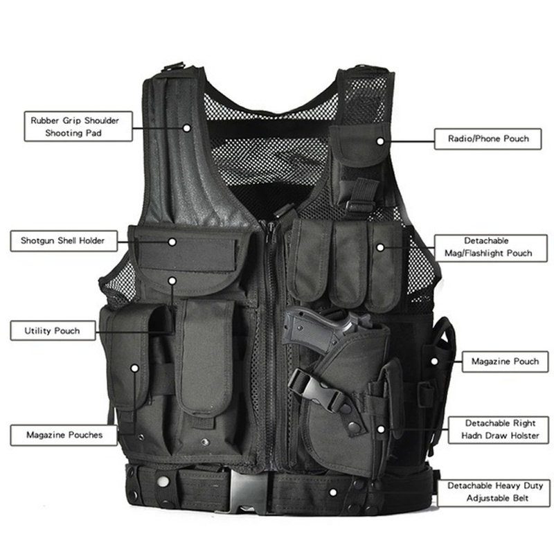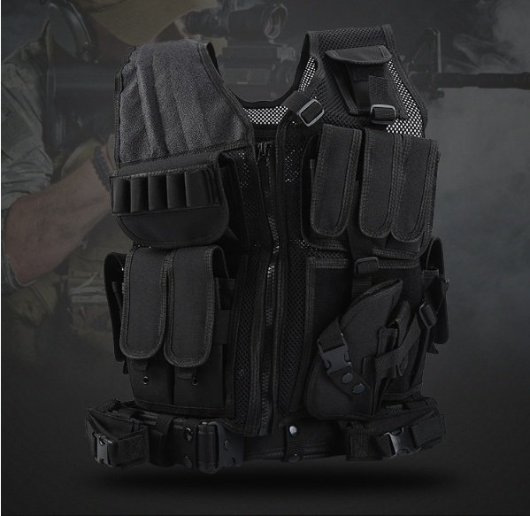 Shoulder and waist side part adopt magic tape and buckle design which enables you to wear and take off this tactical vest rapidly and conveniently.